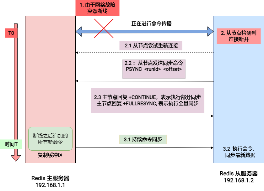 当从节点重新连接到主节点时,它会发送之前保存的主节点运行 ID 和自己的复制偏移量给主节点。