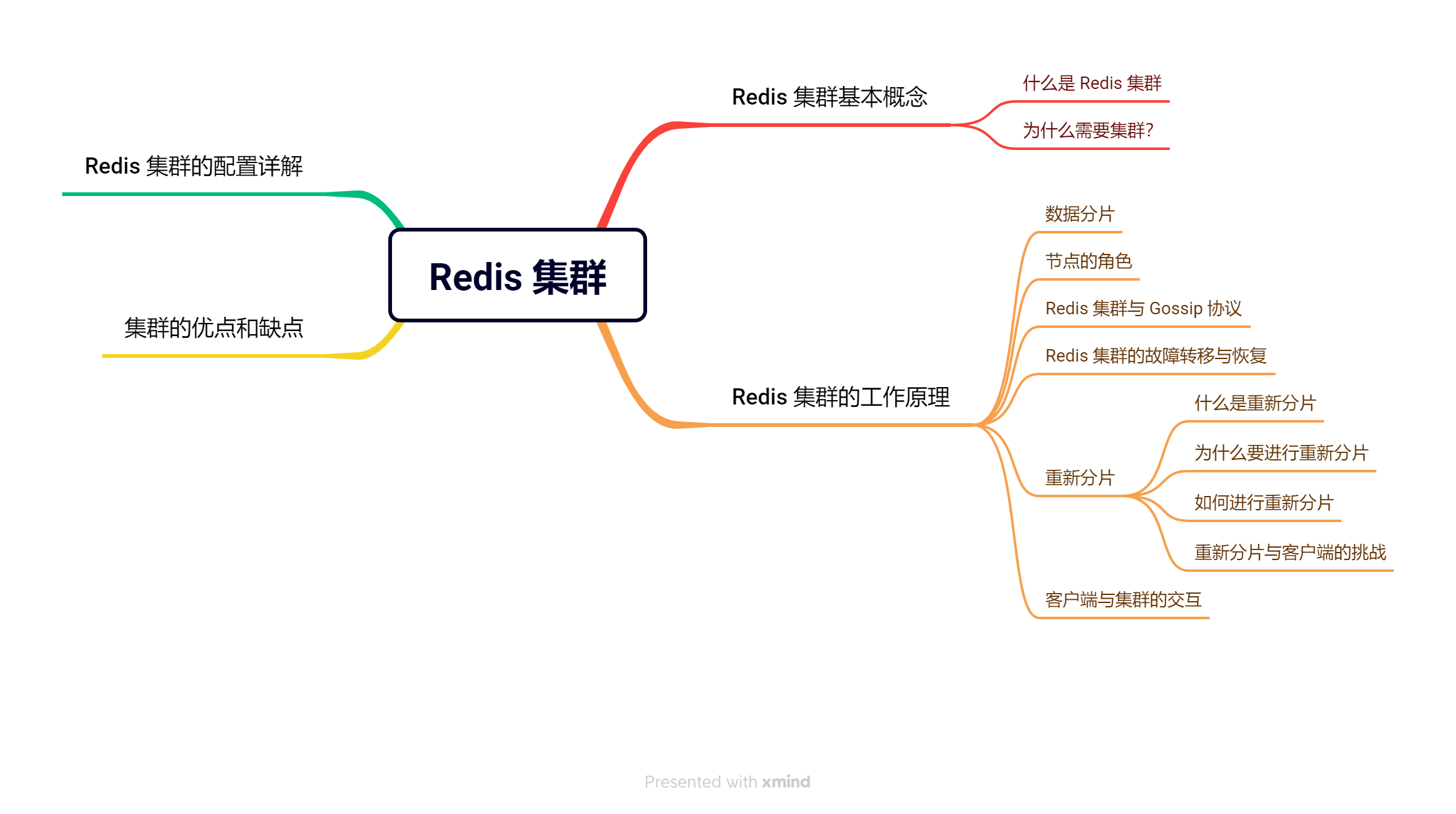 - 工作原理:将数据分布在多个节点上,每个节点存储一部分数据,通过哈希槽来定位数据的位置。