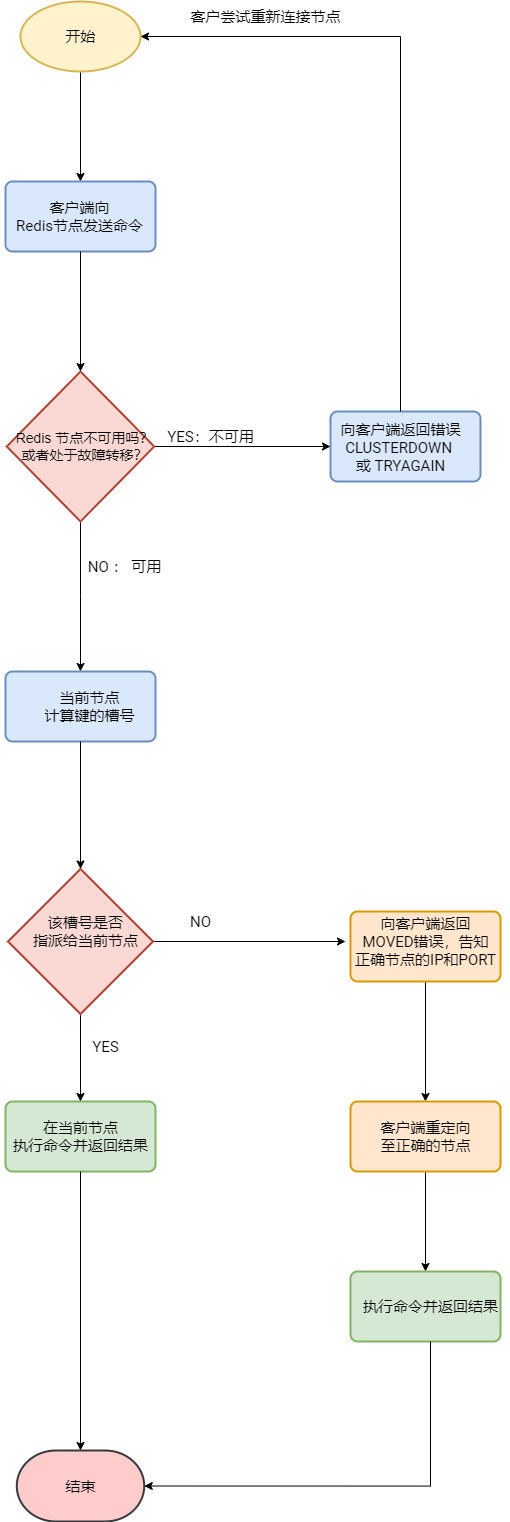 客户端首先向已知节点发送命令,如果某个节点暂时不可用或发生了故障转移,客户端可能会收到 CLUSTERDOWN 或 TRYAGAIN 错误。在这种情况下,客户端应该稍等片刻,并重新尝试操作,因为集群很可能在短时间内自我恢复。
