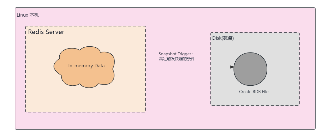 RDB 持久化方式是 Redis 将当前内存中的数据快照(snapshot)保存到硬盘的过程。换句话说,Redis 会创建一个代表某一时刻的数据集的磁盘文件。