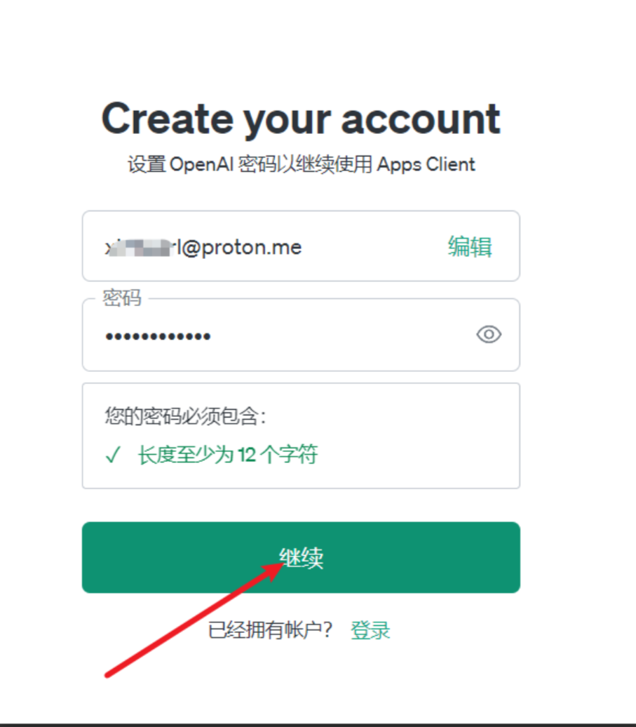 2.1 首先打开 OpenAI 的账户注册页面,然后输入 proton 邮箱。