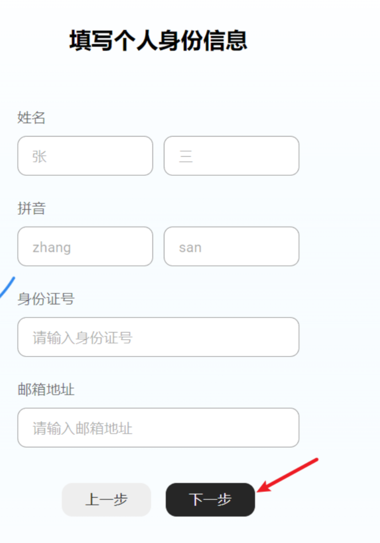 3.下一步之后,填写你自己的个人身份信息【邮箱地址:你就填你容易记得的就行,比如:你叫张三,你就填zhangsan 即可】,然后点击下一步。